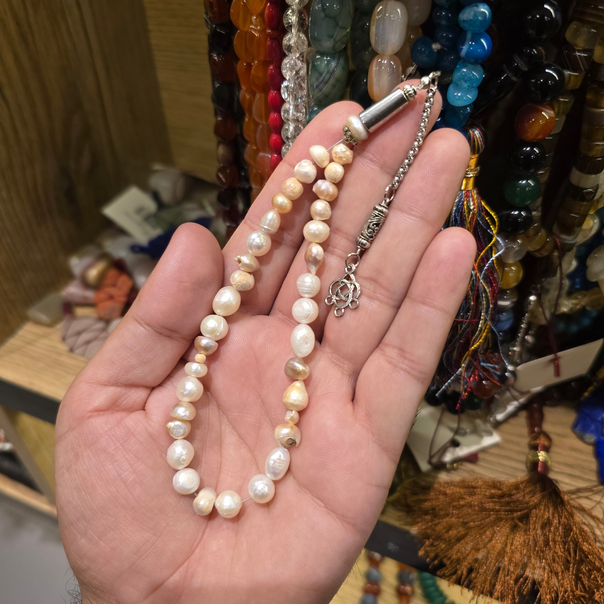 Elegant Motya Pearl Tasbih with 33 radiant pearl beads, crafted to symbolize purity, peace, and devotion. Each motya bead shines with a natural luster, providing a soothing touch during prayer and meditation. Perfect for daily recitation, spiritual gatherings, or as a graceful gift, this tasbih combines simplicity, elegance, and timeless beauty.